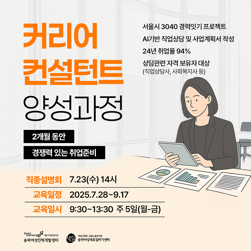 송파여성인력개발센터는 서울시의 「2025 여성미래일자리 프로그램」 공모사업의 일환으로 ‘커리어컨설턴트 양성과정’을 운영한다고 밝혔다. 이번 과정은 서울시의 지원을 바탕으로 미취업 여성들의 직업상담 실무 역량을 강화하고, 현장 중심의 직업상담 전문가를 양성하는 데 중점을 둔다.