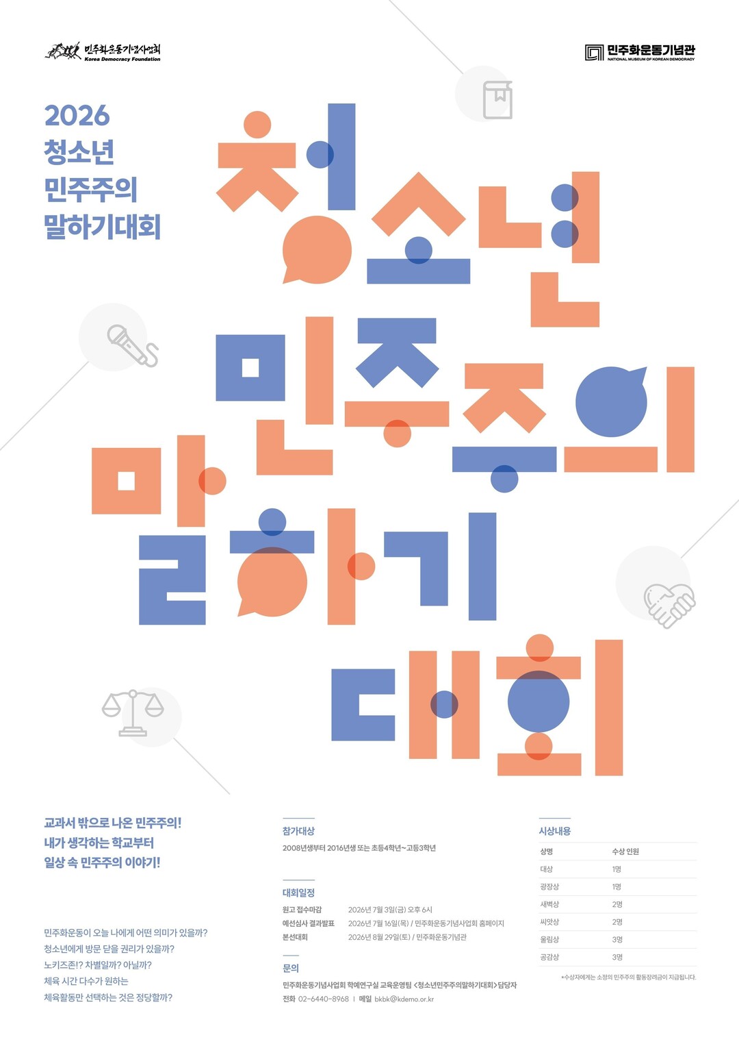 민주화운동기념사업회(이사장 이재오)는 ‘2026년 청소년 민주주의 말하기대회’를 개최하고 4월 2일부터 7월 3일까지 예선 접수를 진행한다고 밝혔다.