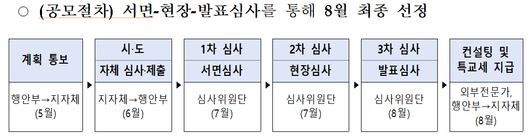 공모사업은 기초지자체는 광역지자체를 통해 신청하고, 광역지자체는 6월말까지 행안부로 제출해야 한다. 이후 서면, 현장, 발표의 3단계 심사를 거쳐 최종적으로 선정된 지자체는 오는 8월 중 발표하고 하반기 중 사업에 착수할 수 있다.