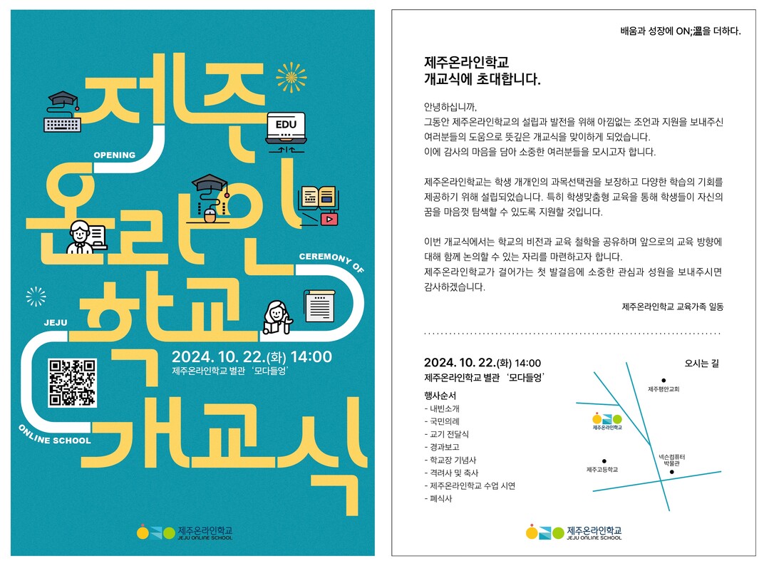 개교식에는 김광수 제주특별자치도교육감을 비롯해 오승식 도의회 교육위원회 위원장, 문홍철 제주온라인학교운영위원회 위원장 등 50여 명이 참석할 예정이다.