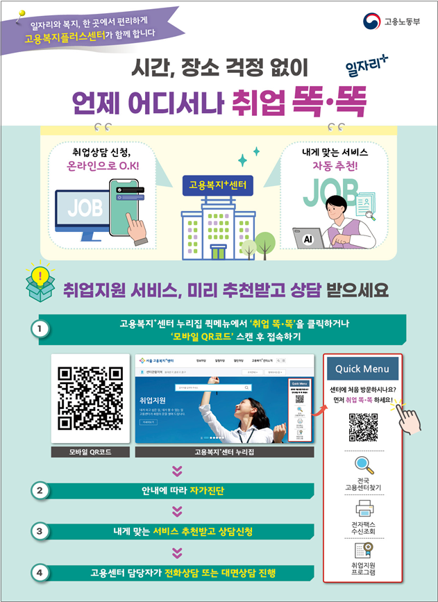 이민재 고용서비스정책관은 “이번 ‘취업 똑똑’ 서비스는 국민이 언제 어디서나 쉽게 취업의 문을 두드릴 수 있는 기회를 제공할 것”이라며, “고용, 금융, 복지 등 복합적 문제 해결을 위해 고용복지플러스센터가 중심이 되어 취업 취약계층에 대한 통합적 지원을 강화해 나갈 것”이라고 밝혔다.