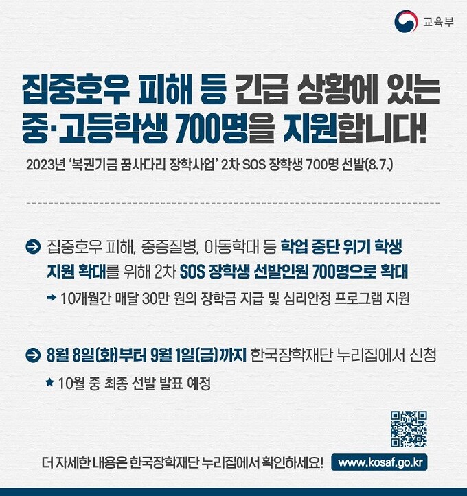 교육부와 한국장학재단은 긴급 상황에 있는 중·고등학생들이 학업을 중단하지 않도록 올해 복권기금 꿈사다리 장학사업을 통해 SOS 장학생을 선발했다고 지난 22일 밝혔다.