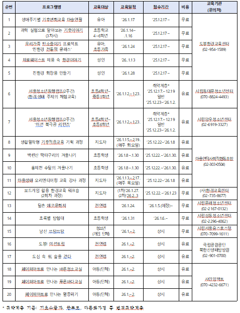각 프로그램은 참여 대상과 접수 방식, 교육 기간, 참가 비용이 서로 달라 사전 확인이 필요하며, 자세한 사항은 각 교육기관 또는 서울환경교육플랫폼(seec.or.kr)에서 확인할 수 있다.
