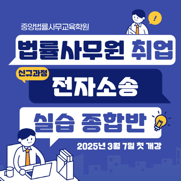 학원 관계자는 “법률사무원 취업 및 전자소송 실습 종합반 과정은 3월 7일 첫 개강을 앞두고 있으니 많은 관심 부탁드린다. 과정에 대한 문의는 중앙법률사무교육학원 홈페이지 또는 대표전화를 통해 가능하다”고 전했다.