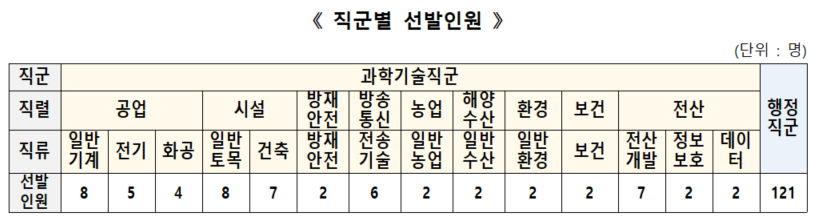 이번 선발 인원은 과학기술직군 59명, 행정직군 121명으로 구성됐다. 과학기술직군은 공업·시설·방재·안전·방송통신·농업·해양수산·환경·보건·전산 등 다양한 직렬에서 고르게 뽑는다.