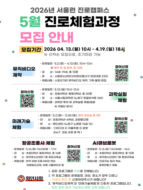 5월 프로그램은 4개 기관에서 진행된다. 시립청소년미디어센터에서는 뮤직비디오 제작 과정을 통해 기획, 촬영, 편집까지 콘텐츠 제작 전 과정을 경험할 수 있다. 노원청소년미래진로센터에서는 자율주행, 로봇, IoT 코딩 등 미래기술 체험이 운영된다. 이 밖에도 항공조종 시뮬레이션과 과학 실험 프로그램이 마련돼 다양한 분야를 접할 수 있다.