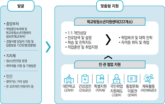 전국 222개 꿈드림센터는 학교 밖 청소년들이 학업을 지속할 수 있도록 다양한 지원을 제공하고 있으며, 이 지원에는 검정고시와 수능 대비반, 의무교육 단계 미취학 및 학업 중단 학생을 위한 학습 지원 등이 포함된다.