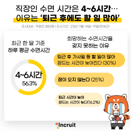 인크루트는 직장인 880명을 대상으로 11월 14일부터 19일까지 6일간 ‘직장인의 수면시간과 질’을 알아보기 위해 설문조사를 진행했다고 22일 밝혔다.