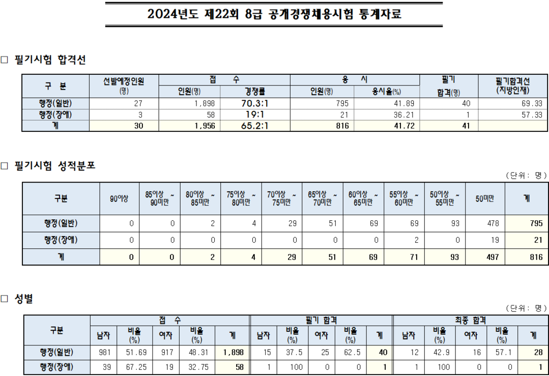 한편, 올해 필기시험 합격선은 행정(일반) 69.33점, 행정(장애) 57.33점으로, 지난해와 비교하여 행정(일반)이 무려 10.67점이나 하락했고, 반면 행정(장애)은 2점 상승한 것으로 나타났다.