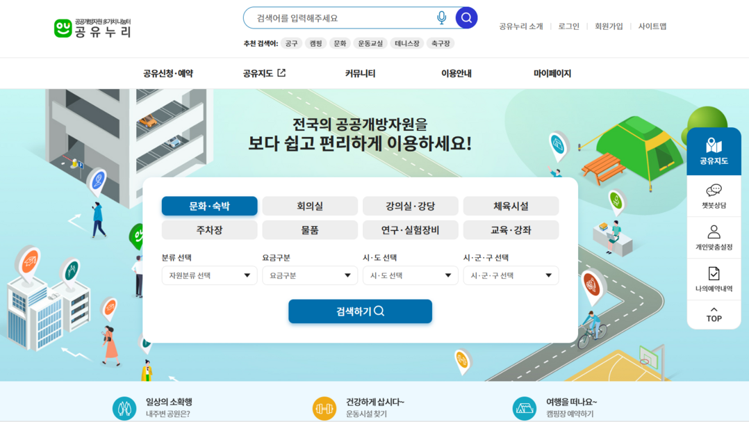 이용자는 누리집 또는 앱에서 원하는 자원의 지역·이용 요금 등을 검색하고 예약·결제까지 간편하게 처리할 수 있다. 또한 공유지도 기능을 통해 근처에서 대여 가능한 자원을 한눈에 확인할 수 있으며, 회원가입 시 개인 맞춤형 서비스도 제공된다.