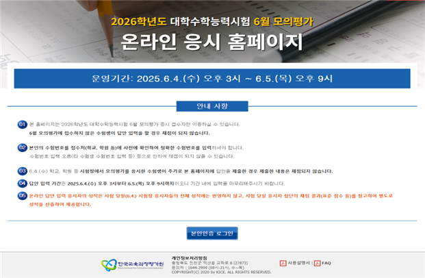 시험 당일 불가피하게 현장 응시가 어려운 수험생을 위해 온라인 응시 홈페이지(https://icsat.kice.re.kr)도 운영된다. 온라인 응시는 6월 4일 오후 3시부터 다음 날 밤 9시까지 가능하며, 개별 수험번호 등 정보를 입력해 교시별로 응시할 수 있다.