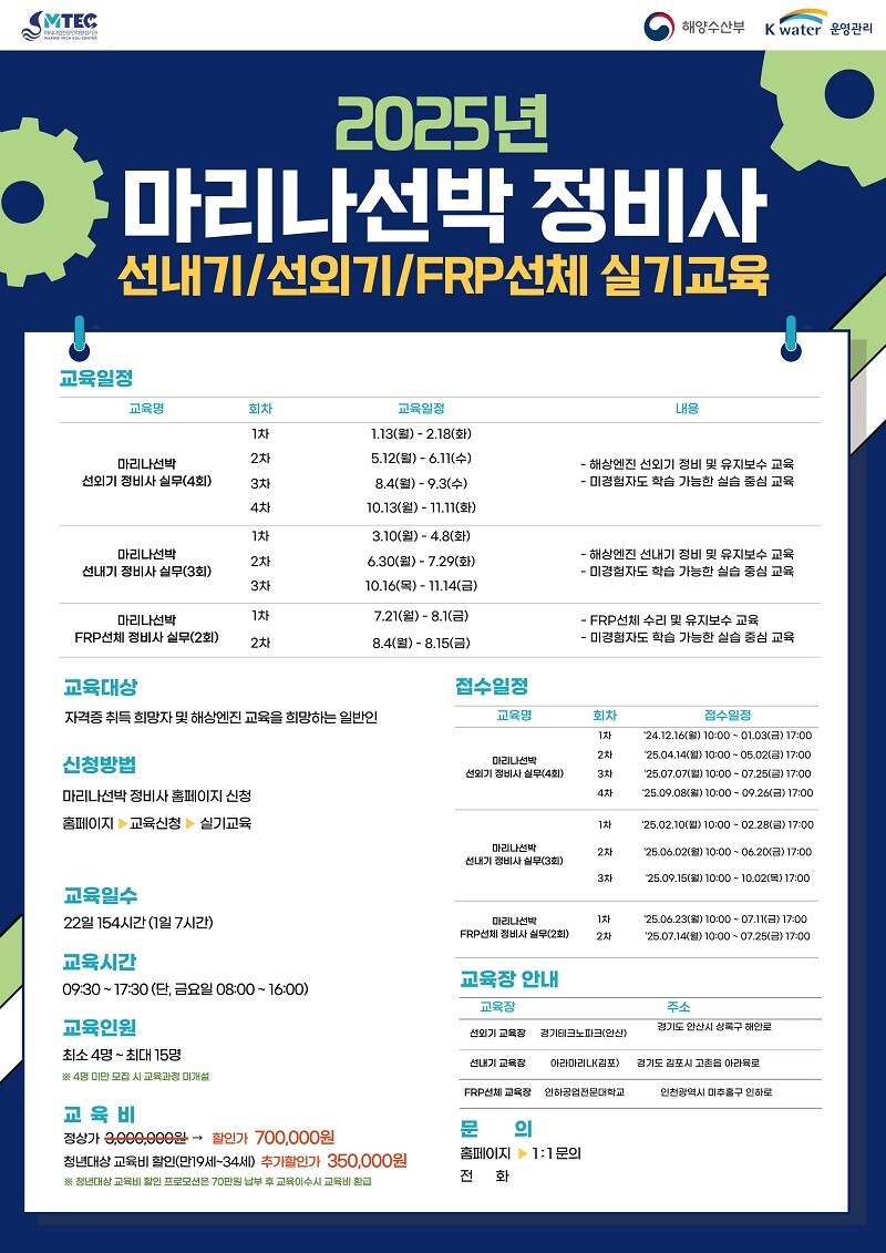 케이워터운영관리(주)는 마리나선박정비사 국가자격증 취득을 위한 2025년도 교육과정 일정을 공개했으며, 교육생을 모집한다고 17일 밝혔다.