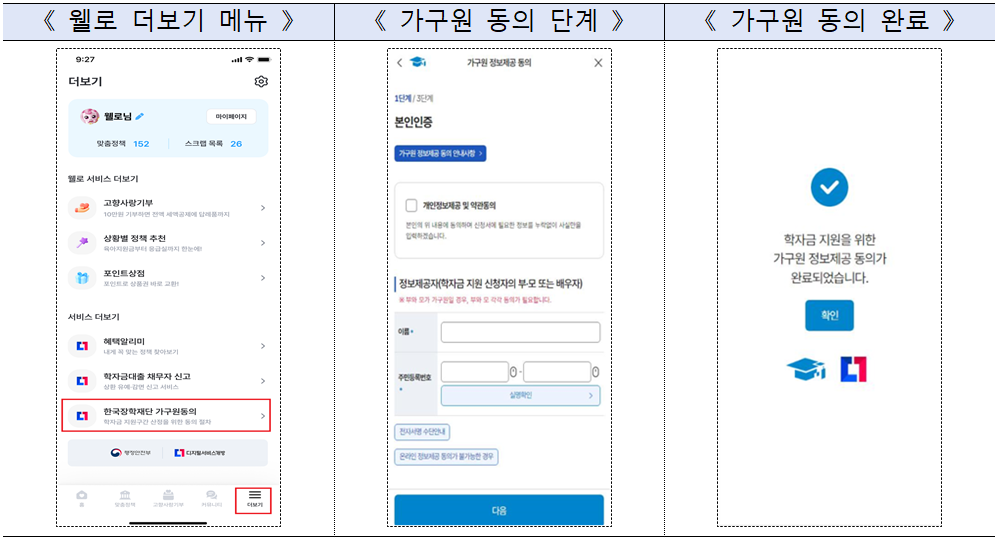 이번 개방으로 가구원은 안내 문자를 받은 후 웰로 앱에 접속해 간단히 동의 절차를 진행할 수 있다. 예를 들어, 국가장학금을 신청한 나개방 씨의 부모가 웰로 앱을 통해 손쉽게 동의를 완료하는 식이다.