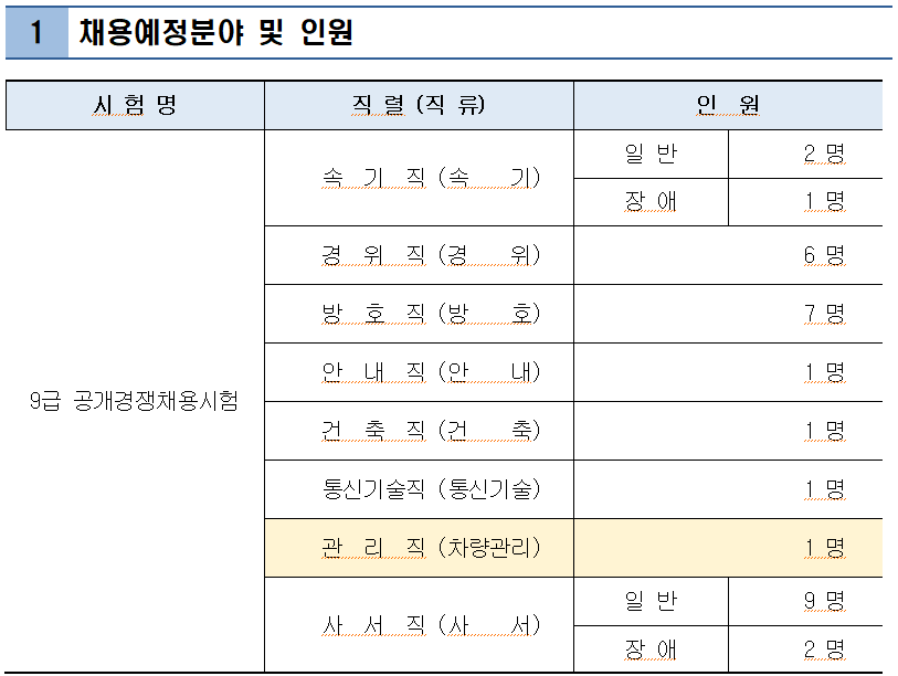 관리직(차량관리) 1명이 증원되어 올해 국회직 9급 총 선발인원은 31명으로 늘었다.