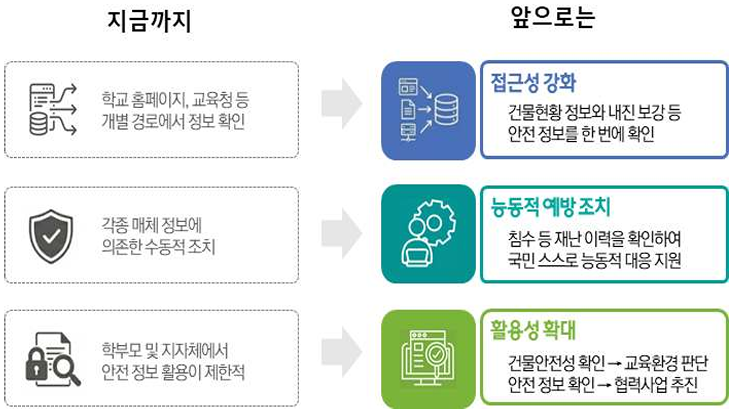 이를 통해 학부모는 자녀 학교의 안전 수준을 보다 정확하게 파악할 수 있고, 지자체는 학교시설을 기반으로 한 문화·체육시설 협력사업 등을 체계적으로 계획할 수 있다.