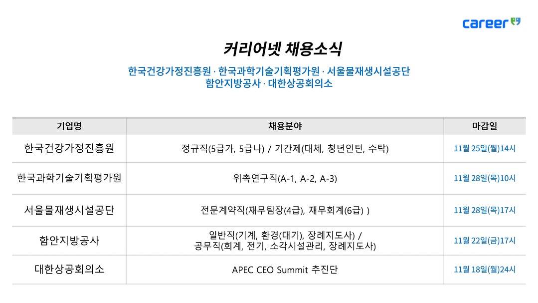 [피앤피뉴스=마성배 기자] 18일 커리어는 한국건강가정진흥원, 한국과학기술기획평가원, 서울물재생시설공단, 함안지방공사, 대한상공회의소 등 주요 공공기관과 공기업의 채용 소식을 전했다. 정규직, 계약직, 인턴 등 다양한 직군을 대상으로 모집이 진행되며, 각 기관별 지원 마감일이 다르므로 확인이 필요하다.