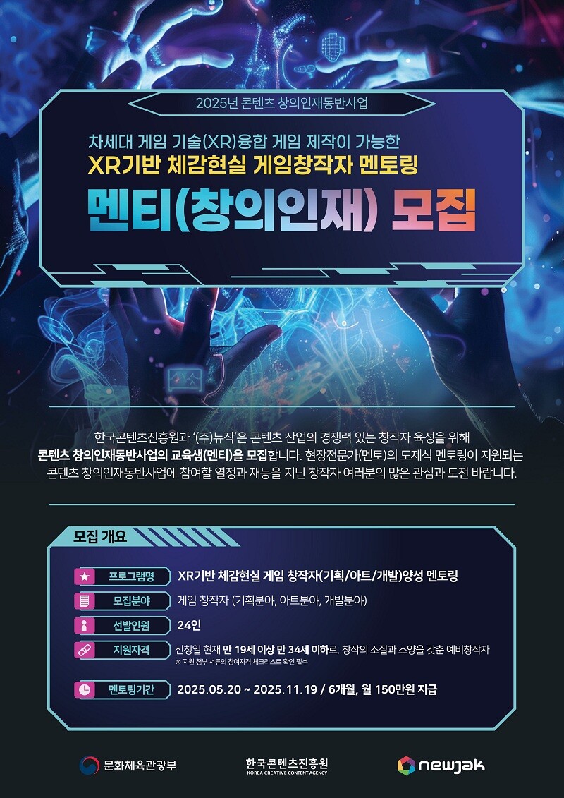 ㈜뉴작은 한국콘텐츠진흥원과 함께 2025년 콘텐츠 창의인재동반사업의 일환으로 ‘XR기반 체감현실 게임 창작자(기획/아트/개발) 양성 멘토링’ 프로젝트에 참여할 멘티(창의인재)를 오는 5월 7일(수) 오후 2시까지 모집한다고 밝혔다.