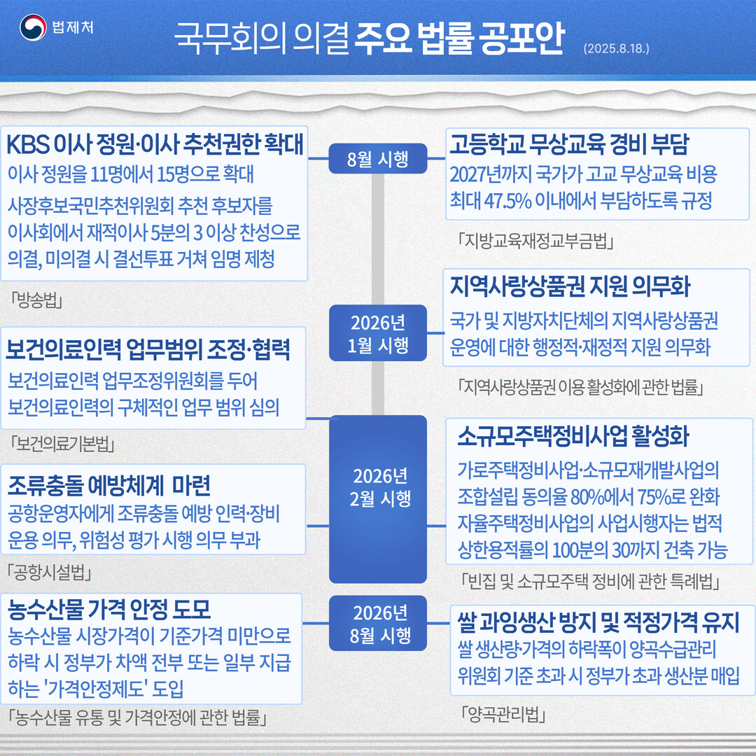 법제처(처장 조원철)는 지난 8월 4일과 5일 국회를 통과한 15개의 법률 공포안이 18일 국무회의에서 확정됐다고 밝혔다. 이번에 시행되는 법안들은 농업·방송·교육·주거·보건 등 국민 생활과 밀접한 영역을 아우른다.