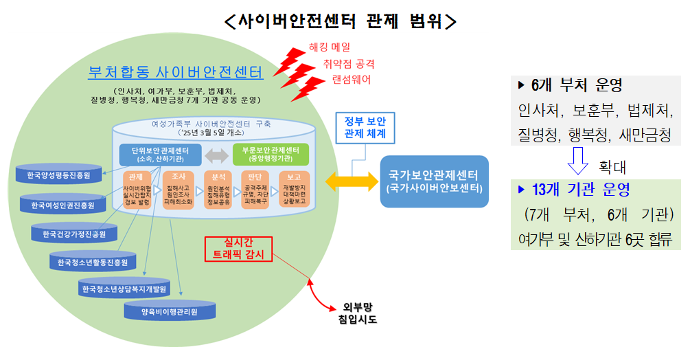 부처 합동 사이버안전센터는 정부 최초의 부처 간 협업 모델로, 2021년 출범 이후 중앙행정기관의 가상공간(사이버) 위협과 전산망 장애에 실시간 대응하고 있다. 이번 확대 운영으로 총 13개 기관이 통합 관제를 구축하게 됐다.