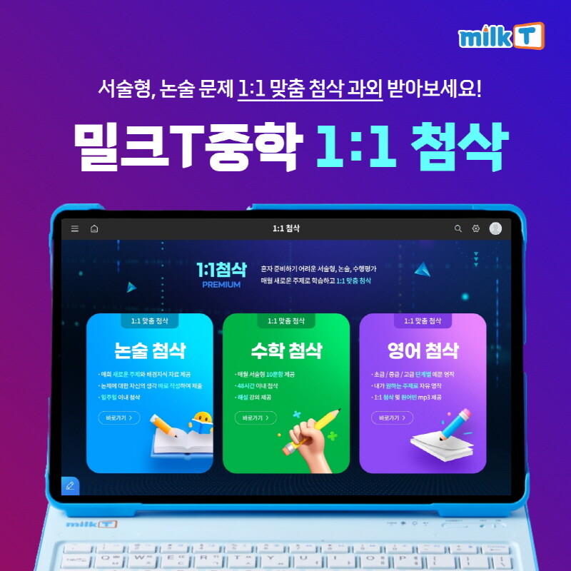 현재 1:1 첨삭 서비스는 밀크T중학 전용 학습기기를 통해서만 제공된다.