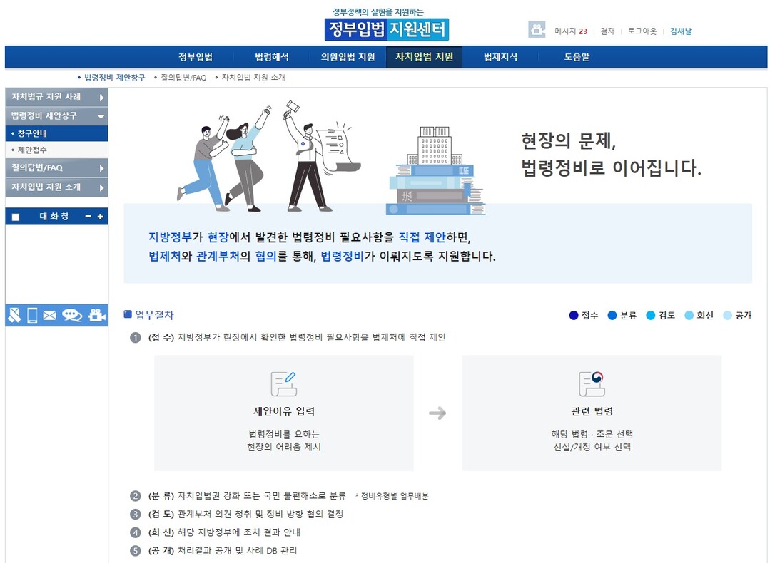 법제처는 12월 29일부터 중앙 및 지방정부 공무원이 이용하는 정부입법지원센터에 ‘법령정비 제안창구’를 개설·운영해 지방정부가 법령 정비가 필요하다고 판단하는 사항을 상시 제안할 수 있도록 한다고 밝혔다.