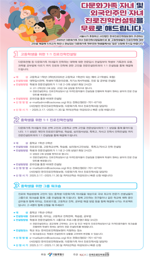 참여를 원하는 학생이나 학부모는 서울시 한울타리 누리집(https://www.mcfamily.or.kr), 서울외국인포털(https://global.seoul.go.kr)을 통해 신청 정보를 확인할 수 있으며, (사)한국진로진학정보원 이메일(admin@ceckorea.org) 또는 전화(02-701-6716)로도 신청이 가능하다.