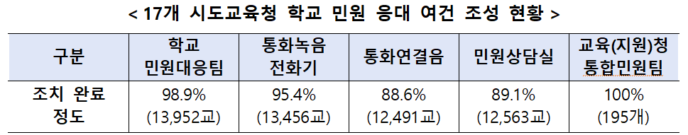 민원대응팀(학교) 98.9%, 통합민원팀(교육청) 100% 등 민원대응체계 구축