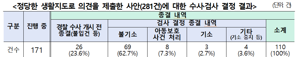 교육부는 교원의 정당한 생활지도를 아동학대로 보지 않도록 관련 법률을 개정했다. 지난해 9월 25일부터 시행된 교육감 의견 제출 제도는 교원 대상 아동학대 신고 385건 중 281건(73%)에 대해 ‘정당한 생활지도’로 의견을 제출했다. 그 중 수사 결정이 완료된 110건 중 95건(86.3%)이 불기소 또는 불입건으로 종결되었고, 제도 도입 이후 아동학대 신고는 감소 추세를 보였다.