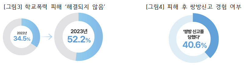 또한, 피해 학생의 48.8%는 가해 학생으로부터 사과를 받지 못한 것으로 나타났다. 보호자 인식조사에서는 40.6%의 보호자가 가해 측으로부터 쌍방신고를 당했다고 응답했다.