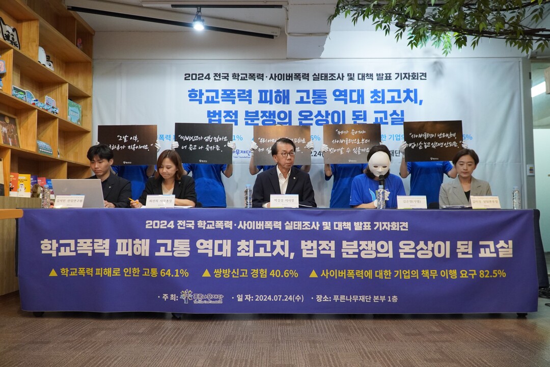푸른나무재단은 24일 서초동 본부에서 ‘2024 전국 학교폭력·사이버폭력 실태조사 및 대책’을 발표했다.