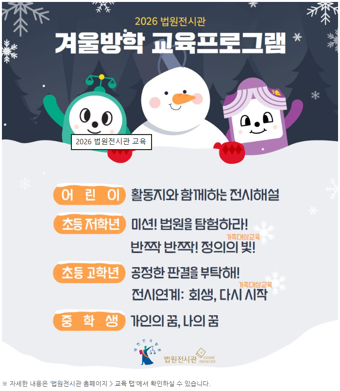 [피앤피뉴스=마성배 기자] 대법원 법원전시관이 2026년 겨울방학 기간을 맞아 아동·청소년을 위한 체험형 교육프로그램을 운영한다. 전시관은 올해 겨울방학에 총 6개 프로그램 83회를 마련해 법과 정의에 대한 이해를 높이는 배움의 기회를 제공한다고 밝혔다.
