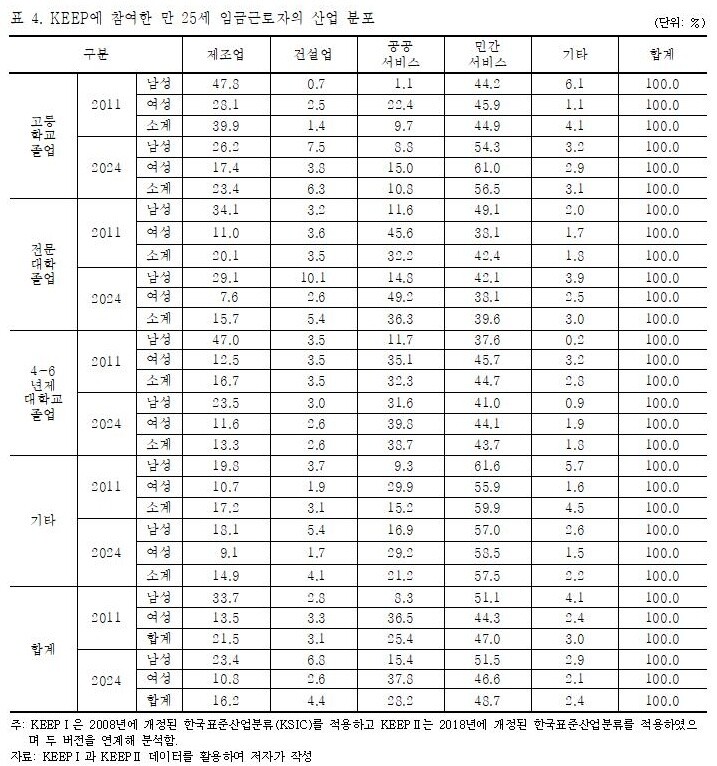 분석 결과 만 25세 청년 임금근로자가 종사하는 산업 전반에서 제조업 비중은 하락하고 공공서비스와 민간서비스 비중은 증가했다. 고졸 남녀 집단에서는 제조업 취업 비율이 39.9%에서 23.4%로 급락한 반면, 건설업은 1.4%에서 6.3%로 늘었고 민간서비스는 44.9%에서 56.5%로 확대됐다. 전문대 졸업 집단에서도 제조업은 20.1%에서 15.7%로, 민간서비스는 42.4%에서 39.6%로 감소했으나 건설업은 3.5%에서 5.4%로, 공공서비스는 32.2%에서 36.3%로 각각 증가했다.