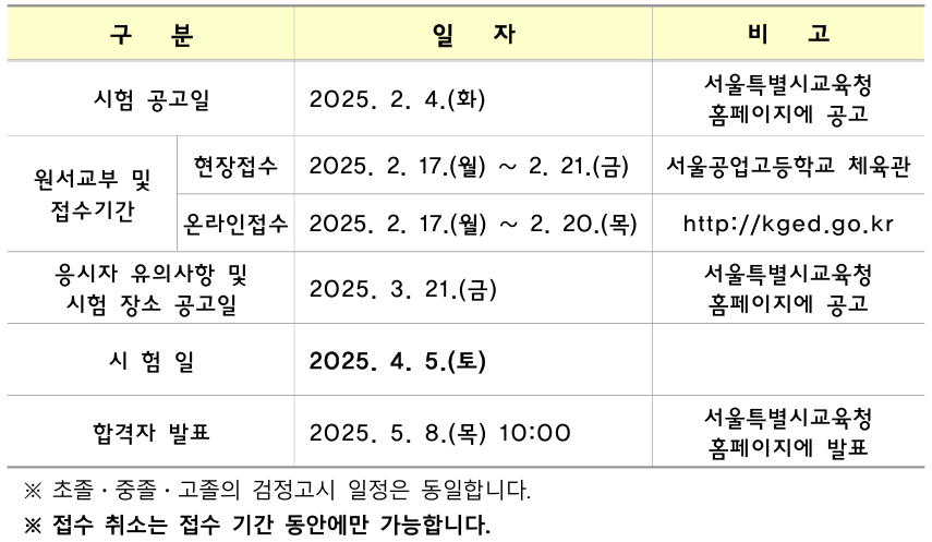 시험 일정, 시험 과목, 응시 자격 등 자세한 사항은 서울시교육청 홈페이지(www.sen.go.kr → 새소식/공지 → 시험안내 → 검정고시안내)**에서 확인할 수 있다.