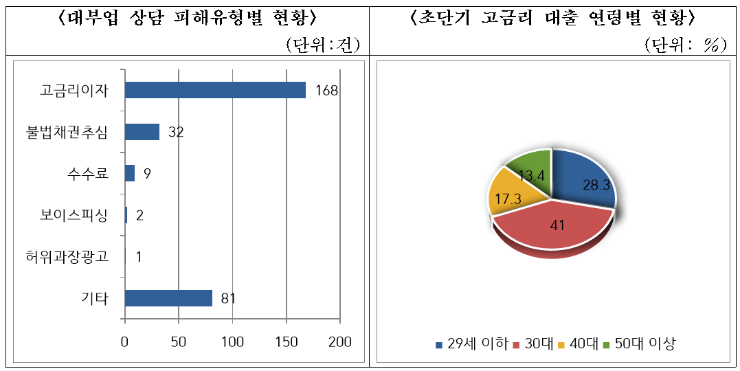 서울시 공정거래종합상담센터에 따르면 2023년 대부업 관련 상담 293건 중 고금리 이자 상담이 168건(약 76%)에 달했으며, 특히 30대 이하가 초단기 고금리 대출 피해의 69.3%를 차지해 청소년과 젊은 층의 피해가 심각한 것으로 나타났다.