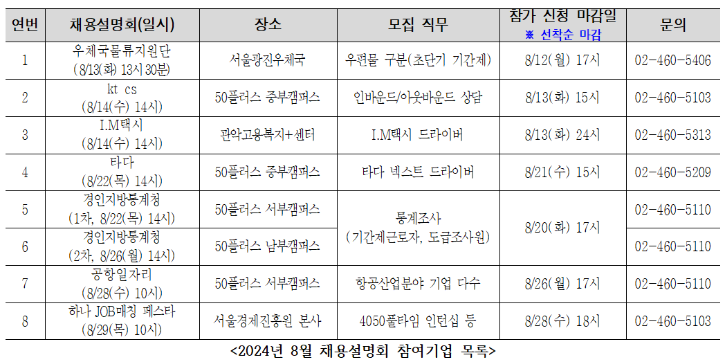 이번 채용설명회에는 기존 참여기업 외에도 신규 기업들이 포함된다. 특히, 13일에는 우체국물류지원단이 서울광진우체국에서 초단기 기간제 채용설명회를 개최하며, 14일에는 kt cs가 서울시50플러스 중부캠퍼스에서 상담업무 직무를 모집한다.