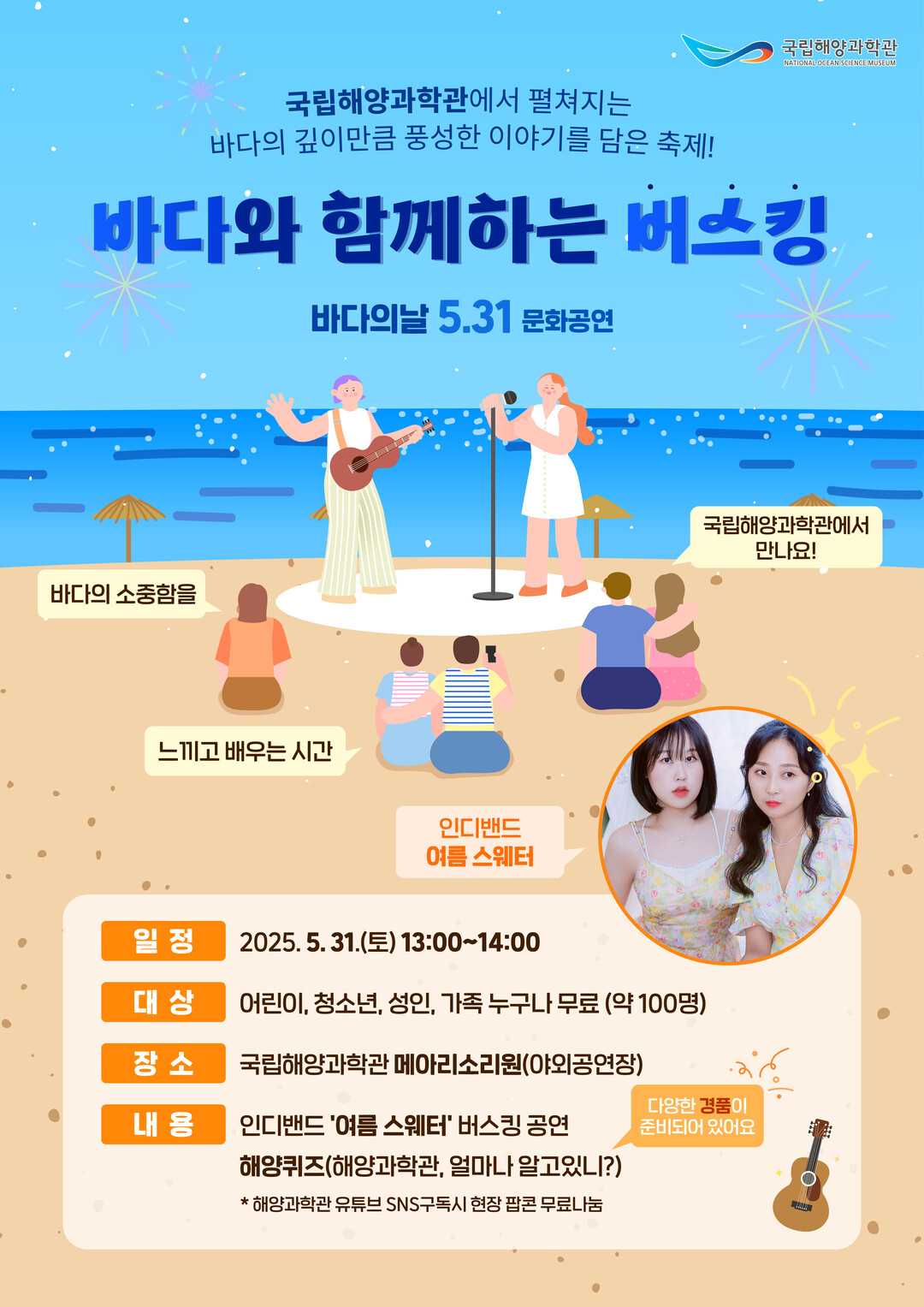 야외무대에서는 과학과 공연이 결합된 이색 무대도 마련된다. ‘과학 마술 콘서트’에서는 과학 원리를 활용한 마술 퍼포먼스로 눈길을 끌 예정이며, 버스킹 무대인 ‘바다와 함께하는 버스킹’에서는 다양한 장르의 음악 공연과 함께 미니 퀴즈 이벤트 ‘해양과학관, 얼마나 알고 있니?’가 진행된다.