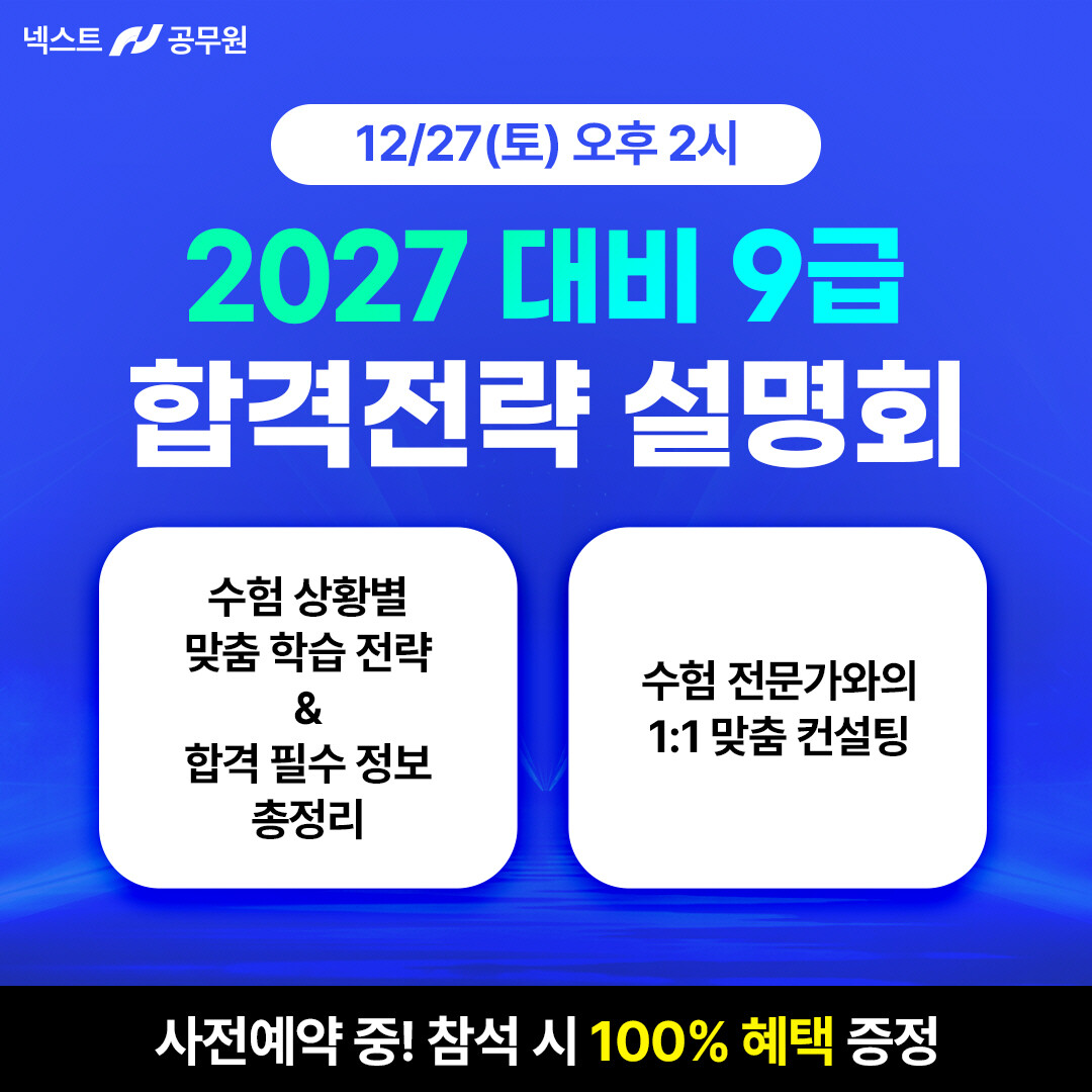 공무원 시험 전문 브랜드 넥스트공무원이 오는 12월 27일(토) 오후 2시 노량진 메가스터디타워 7층 넥스트공무원학원에서 9급 공무원 시험을 준비하는 수험생들을 대상으로 ‘2027 대비 9급 합격전략 설명회’를 개최한다고 밝혔다.