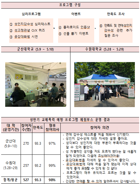배동인 정책기획관은 “대학생 교제 폭력이 심각해져 기존 온라인 위주의 폭력 예방 교육만으로는 한계가 있어, 앞으로도 성인지 감수성 점검 및 공감 대화법 연습 등을 체험할 수 있는 다양한 기회를 제공해 폭력 없는 안전한 캠퍼스 문화를 조성할 수 있도록 지원하겠다”고 강조했다.