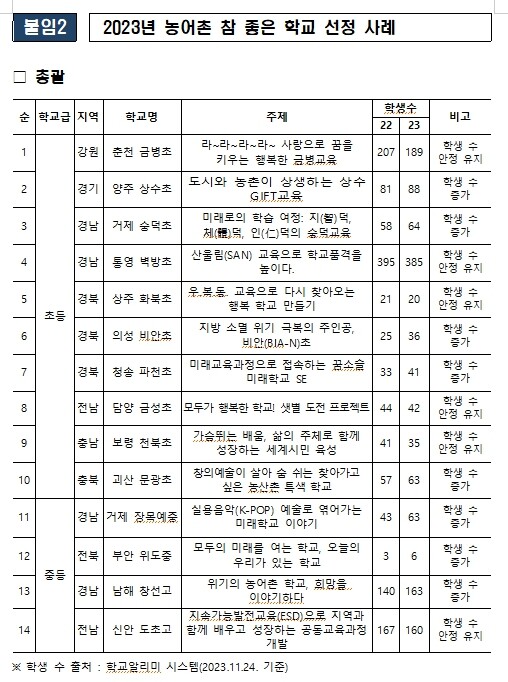 [피앤피뉴스=마성배 기자] 교육부는 ‘2023 농어촌 참 좋은 학교 공모전’에 14개 학교가 선정되었다고 지난 4일 밝혔다.