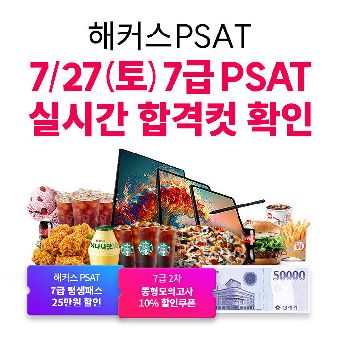 추가로 시험일부터 3일간 채점자 전원에게는 국가직 7급 2차 시험에 대비할 수 있는 ‘7급 전용 수강료 100% 환급 평생 패스’ 25만 원 할인쿠폰과 7급 2차 동형모의고사 10% 할인쿠폰도 제공할 예정이며, 채점 후 간단한 설문조사 응답 시에는 빙그레 바나나우유도 제공한다.