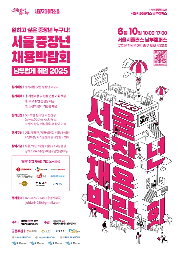이번 채용박람회는 서울시50플러스재단이 주관하는 생활권 중심의 현장 채용행사로, 중장년 구직자들이 멀리 이동하지 않고도 거주지 인근에서 채용정보를 얻고 실제 면접까지 볼 수 있도록 돕는 ‘밀착형 고용서비스’다. 특히 재단이 운영하는 서울 5개 권역 캠퍼스(서부·중부·남부·북부·동부)에서 각각 진행돼 지역 내 고용기관 및 기업과의 유기적 협업도 강화된다.
