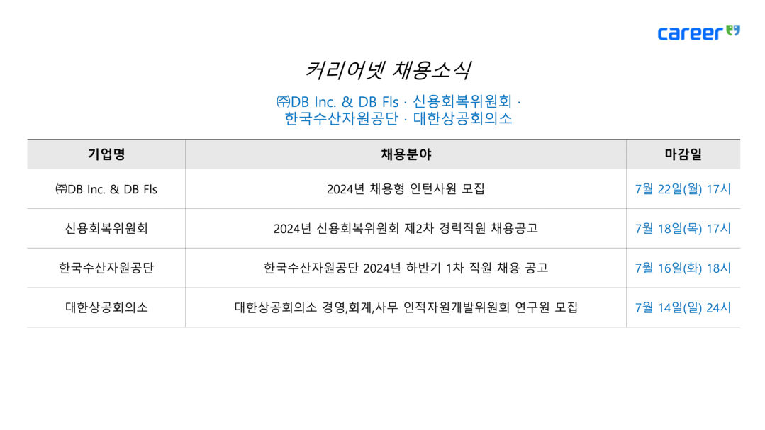 [피앤피뉴스=마성배 기자] 취업 포털 커리어가 8일 신용회복위원회, 한국수산자원공단, 대한상공회의소, DB Inc. & DB FIS 등 채용 소식을 전했다.