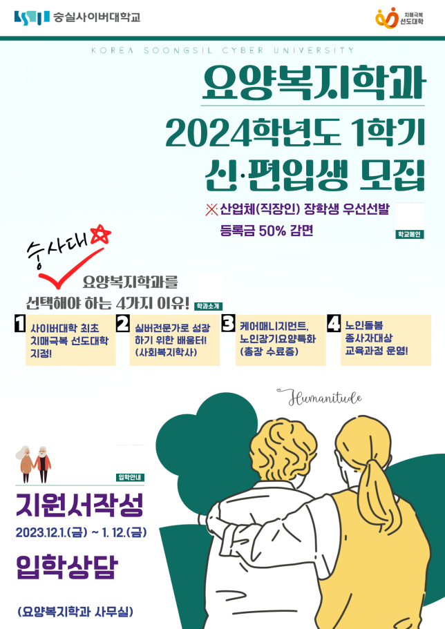 [피앤피뉴스=이수진 기자] 숭실사이버대학교는 2011년 시작하여 지속적인 교육 인프라 첨탑을 구성하고 있다. 큰 카테고리의 인문예술, 휴먼서비스, 융합자산관리, ICT 도시공학부를 기반으로 각각의 28개 학과의 전공강의가 이루어지고 있다. 그 중 조문기 교수가 이끄는 휴먼서비스 학부의 요양복지학과는 대한민국 초고령화시대에 맞춰 노인복지에 통합적이고, 전문적인 지식과 실천능력을 갖춘 인력양성에 매진하고 있다.