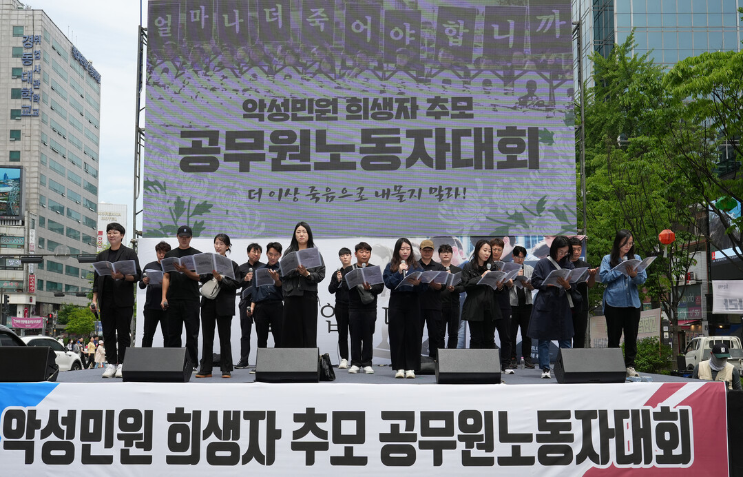 29일 대한민국공무원노동조합총연맹(공노총)과 전국공무원노동조합은 서울 중구 시청역 일대에서 ‘더 이상 죽음으로 내몰지 말라!’라는 슬로건을 내걸고 악성 민원 희생자 추모 공무원노동자대회를 진행했다.