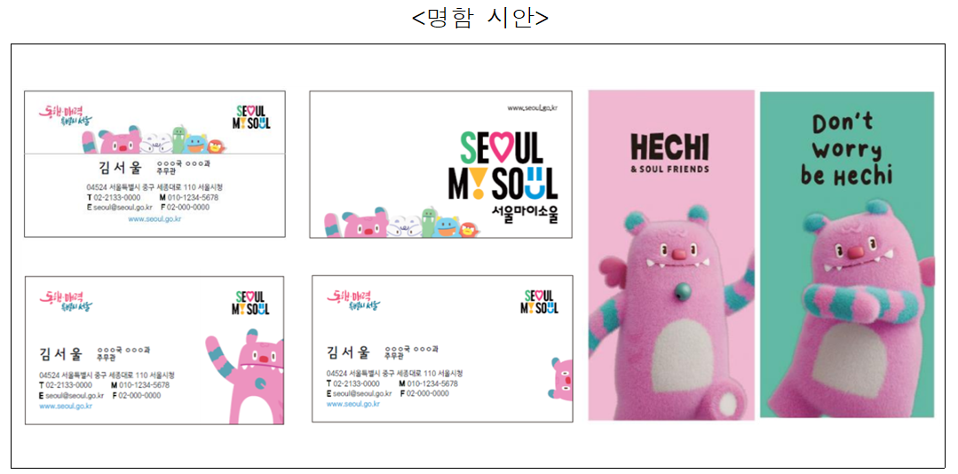 '돈워리 비 해치'라는 슬로건과 함께 생동감 넘치는 색채감을 강조했으며, 해치와 서울의 상징적 이미지를 현대적으로 재해석했다. 또한 명함 하단이나 측면에 배치된 해치&소울프렌즈 캐릭터는 기존 관공서 명함의 경직된 이미지에서 벗어나 시민들에게 더욱 친숙하게 다가갈 수 있도록 했다.
