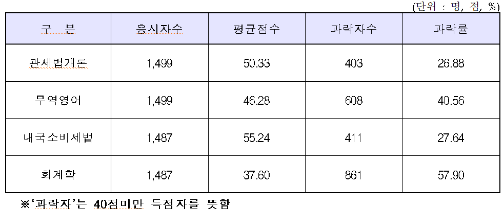 과목별 과락률은 무역영어 40.56%, 내국소비세법 27.64%, 관세법개론 26.88% 순으로, 회계학과 관세법개론은 지난해보다 과락률이 상승했고, 무역영어와 내국소비세법은 떨어졌다.