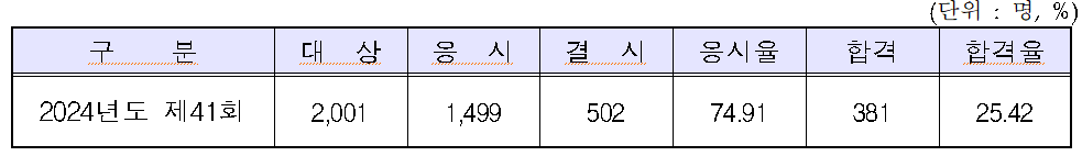 그 결과, 응시대상자 2,001명 중 1,499명이 실제 시험에 응시해 74.91%의 응시율을 보였고, 이 가운데 381명이 합격하여 25.42%의 합격률을 기록했다.