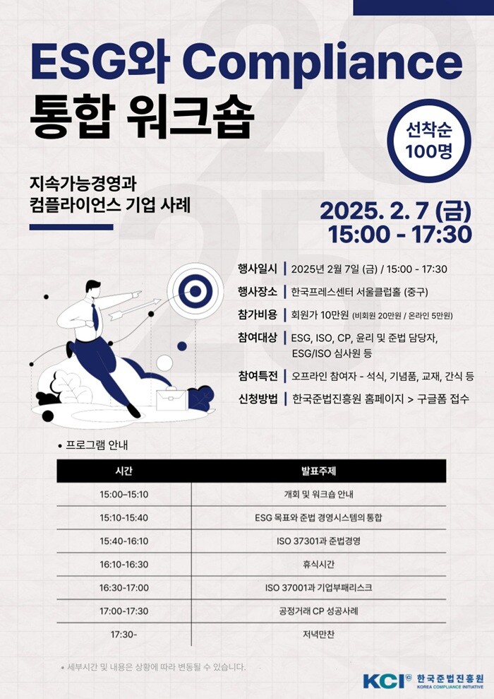[피앤피뉴스=이수진 기자] 한국준법진흥원(KCI)은 오는 2월 7일 오후 3시, 서울 중구 한국프레스센터에서 ‘ESG와 Compliance 통합 워크숍’을 개최한다. 이번 행사는 지속가능경영과 준법경영 실현을 위해 기업의 최신 사례와 전략을 공유하고, 관련 실무자들에게 실질적인 정보를 제공하기 위해 마련됐다.