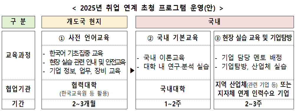 올해 첫 시행되는 이번 프로그램은, 국내 우수 교육 인프라를 활용해 개도국 학생들에게 실무 중심 교육과 산업체 경험을 제공함으로써, 이들이 자국 내 핵심 산업 인력으로 성장할 수 있는 기반을 마련한다는 점에서 의의가 크다. 동시에 국내 기업 입장에서는 현지 시장에 정통한 우수한 해외 인재를 미리 발굴할 수 있는 기회를 제공받는다.