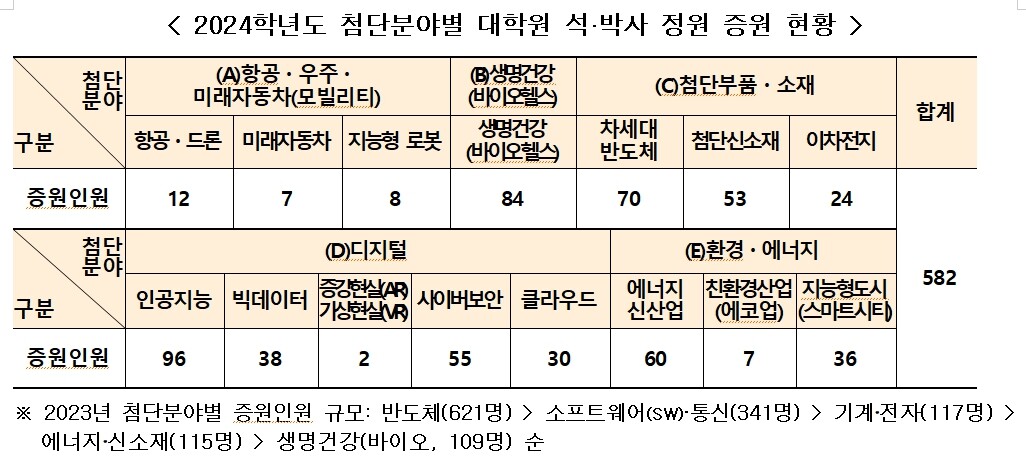 2024학년도 대학원 첨단분야 증원 인원은 석사 485명, 박사 97명이며, 분야별로는 ▲인공지능(96명), ▲생명건강(바이오헬스, 84명), ▲차세대반도체(70명), ▲에너지신산업(60명), ▲사이버보안(55명) 등 디지털 분야에서 집중 증원이 이뤄졌다.